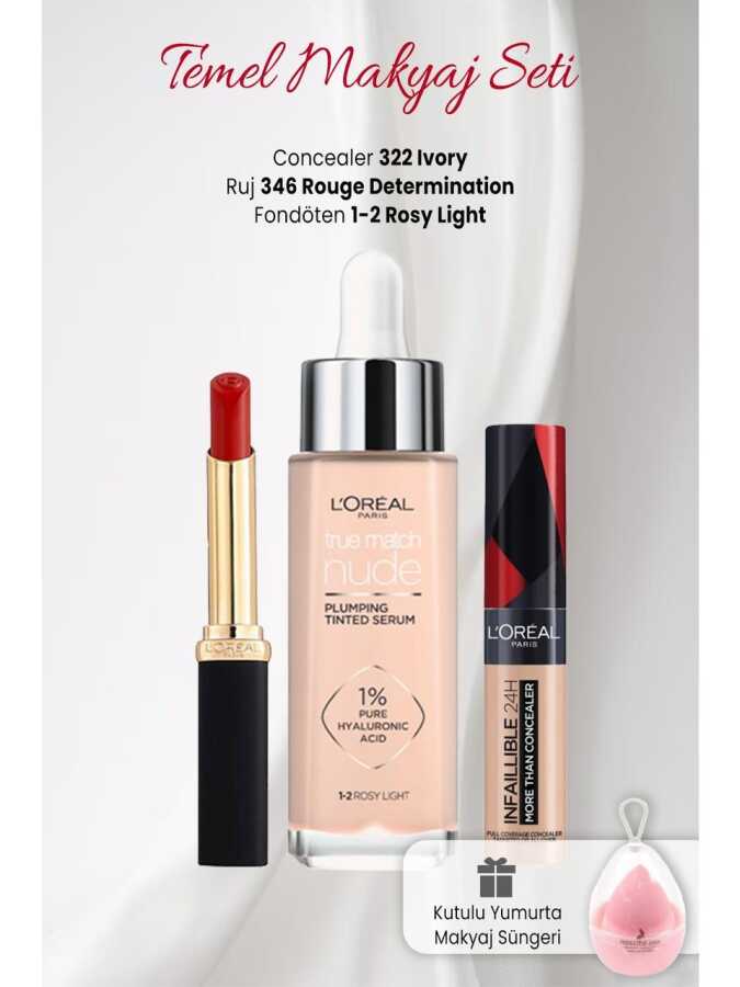 سيروم لوريال باريس ترو ماتش عاري 1-2 ، لون غني 346 ، من كونسيلر 322 وإسفنجة مكياج وردي