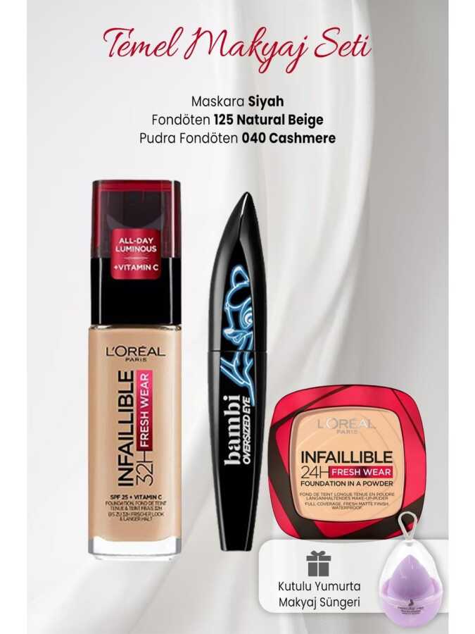 L'Oréal Paris Infaillible 32h Fresh Wear Foundation 125 Natural Beige,L'Oréal Paris Infaillible 24h Fresh Wear Powder Foundation 040 Cashmere,L'Oréal Paris Bambi Oversized Eye Mascara Black,Nascita Boxed Egg Makeup Sponge LilacL'oréal Paris Infaillible 32h Fresh Wear Foundation 125 Natural BeigeThe Infaillible Family's High Coverage and All-Day Long-Lasting Foundation Has Been Renewed with a Formula Containing Vitamin C:L'oréal Paris Infallible 32h Fresh Wear Foundation with Vitamin CLong-Lasting Up to 32 HoursHigh Coverage EffectSmooth and Natural FinishA Brighter and Shining SkinA Formula That Lets the Skin BreatheResistant to Masks, Water and SweatSpf 25L'Oréal Paris Infaillible 24h Fresh Wear Powder Foundation 040 CashmereWith a formula that lasts up to 24 hoursIt covers like a liquid foundation, gives a powder matte finishHigh coverage, matte lookWater and sweat resistantPersonal evaluation, 101 womenL'oreal Paris Infaillible 24h Fresh Wear Powder Foundation, which is viral all over the world, is now in Turkey!The new member of the Infaillable Durable Makeup Family, Infaillable Powder Foundation offers high coverage and a matte finish in one touch. Foundation coverage and powder matte finish in one go!Covers Like Liquid Foundation, Mattifies Like PowderResistant to Water, Sweat and TransferPractical Application at Any Time with the Mirror and Sponge Applicator InsideLong Lasting Up to 24 HoursL'Oréal Paris Bambi Oversized Eye Mascara BlackAre You Ready to Take Your Eyelashes to a Brand New Dimension with Lifting and Xxl Volume Effect? Brand New Bambi Oversized Eye Mascara from L’oréal Paris: Gazelle Eye Effect Now Combined with Eyelash Lifting, Xxl Volume and Lengthening Effect.3 Effects That Take Your Eyelashes to a Brand New Dimension with Bambi Oversized Eye Mascara:Xxl VolumeEyelash Lifting EffectLong Lash AppearanceFlexible Brush: The Brush That Adapts to Every Eye Type Catches Every Eyelash from Root to Tip, It is Anti-Clumping.Formula: Collagen and Ceramide Strengthened FormulaA Brand New Dimension in Your Eyelashes: Gazelle Eye Effect Now with Eyelash Lifting and XXL Volume Effect!Suitable for All Skin TypesSuitable for All AgesNascita Boxed Egg Makeup Sponge LilacDoes not contain rubber raw material.Odorless.Suitable for use with liquid and stick foundation etc. products.All skin types can use it.How to use:First, put the Nascita Makeup Sponge in a glass full of water and wet it for 1-2 minutes.You will see that the product grows as time goes by.Then, squeeze your sponge well to remove the wetness of the product.You can apply makeup products such as foundation, blush and concealer to delicate areas such as the nose and around the eyes with the pointed part of the sponge, and to all facial lines with the round part.