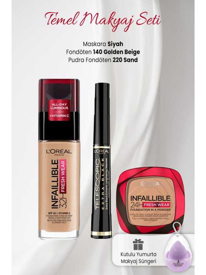 L'Oréal Paris Infaillible 32h Fresh Wear Foundation - 140 Golden BeigeL'Oréal Paris Infaillible 24h Fresh Wear Powder Foundation 220 SandL'Oréal Paris Bambi Eye Extra Black Mascara Extra BlackNascita Boxed Egg Makeup Sponge LilacL'oréal Paris Infaillible 32h Fresh Wear Foundation - 140 Golden Beige,The Infaillible Family's High Coverage and All-Day Long-Lasting Foundation Has Been Renewed with a Formula Containing Vitamin C:L'oréal Paris Infallible 32h Fresh Wear Foundation with Vitamin CLong-Lasting Up to 32 HoursHigh Coverage EffectSmooth and Natural FinishA Brighter and Shining SkinA Formula That Lets the Skin BreatheResistant to Masks, Water and SweatSpf 25L'Oréal Paris Infaillible 24h Fresh Wear Powder Foundation 220 SandWith a formula that lasts up to 24 hoursIt covers like a liquid foundation, gives a powder matte finishHigh coverage, matte lookResistant to water and sweatPersonal evaluation, 101 womenL'oreal Paris Infaillible 24h Fresh Wear Powder Foundation, which is viral all over the world, is now in Turkey!The new member of the Infaillable Durable Makeup Family, Infaillable Powder Foundation offers high coverage and a matte finish in one touch. Foundation coverage and powder matte finish in one go!Covers Like Liquid Foundation, Mattifies Like PowderResistant to Water, Sweat and TransferPractical Application at Any Time with the Mirror and Sponge Applicator InsideLong Lasting Up to 24 HoursL'Oréal Paris Bambi Eye Extra Black Mascara Extra BlackGazelle Eye Effect with Large Looking EyesExtra Black Individually Separated Flawless LashesLooking Eyes Bigger with Striking Lashes Curling from Inside to OutsideBlack &Volume &Curly &Long Looking LashesBrush Reaches, Grabs and Curls Each EyelashClumping Resistant FormulaGazelle Eyes Were Loved a Lot. Now Gazelle Eyes Are Even Blacker: New Bambi Eye Extra Black Gazelle Eye Effect Mascara!Get impressive gazelle looks with Bambi Eye Extra Black inspired by Disney's Bambi character, and now it's even blacker and more intense! Offering intense voluminous eyelashes that curl towards the outer corner, Bambi Eye Extra Black Mascara captures each eyelash with its expert brush, carefully curls, lifts and gives a voluminous look.Blacker, more voluminous eyelashes with Bambi Eye Extra Black Mascara!Nascita Boxed Egg Makeup Sponge LilacDoes not contain rubber raw material.Odorless.Suitable for use with liquid and stick foundation etc. products.All skin types can use it.How to use:First, put the Nascita Makeup Sponge in a glass full of water and wet it for 1-2 minutes.You will see that the product grows over time.Then, squeeze your sponge well to remove the wetness of the product.You can apply makeup products such as foundation, blush and concealer to delicate areas such as the nose and around the eyes with the pointed part of the sponge, and to all facial lines with the round part.