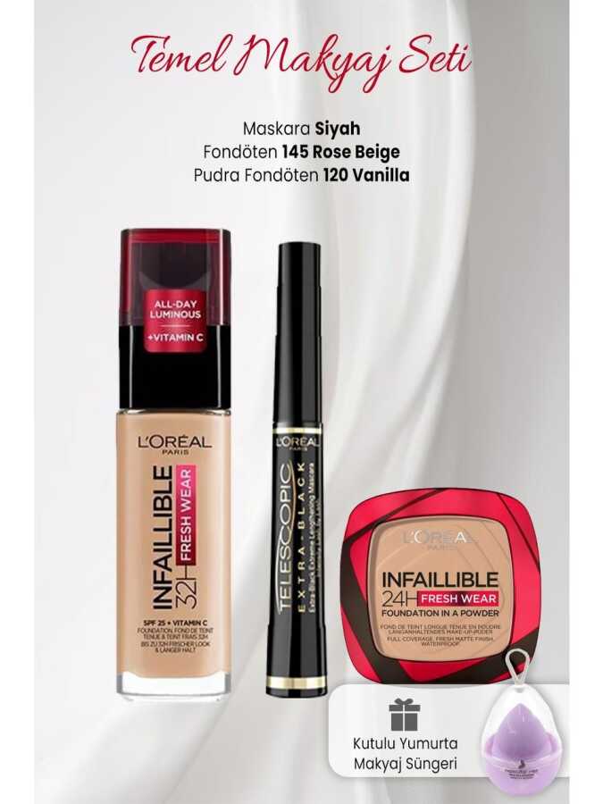 L'oréal Paris Infaillible 32h Fresh Wear Foundation 145 Rose Beige,Infaillible Family's High Coverage and All-Day Foundation Renewed with Vitamin C Formula:L'oréal Paris Infallible 32h Fresh Wear Vitamin C FoundationLasts up to 32 hoursHigh Coverage EffectSmooth and Natural FinishA Brighter and Shining SkinA Formula That Lets the Skin BreatheResistant to Masks, Water and SweatSpf 25L'Oréal Paris Infaillible 24h Fresh Wear Powder Foundation 120 VanillaWith Its Lasting Formula Up to 24 HoursIt Covers Like Liquid Foundation, Gives Powder MatteHigh Coverage, Matte AppearanceResistant to Water and SweatPersonal Evaluation, 101 WomenViral All Over the World L'oreal Paris Infaillible 24h Fresh Wear Powder Foundation is now in Turkey!The new member of the Infaillable Durable Makeup Family, Infaillable Powder Foundation offers high coverage and matte finish in one touch. Foundation coverage and powder matte finish in one go!Covers like liquid foundation, mattifies like powderResistant to water, sweat and transferPractical application at any time with the mirror and sponge applicator insideLong lasting up to 24 hoursL'Oréal Paris Telescopic Carbon Black Mascara BlackTelescopic Long Lash AppearanceFlexible BrushCarbon Black PigmentsLonger, More Visible, Blacker Lashes in One Touch Separates Lashes with its Flexible Comb Brush, Catches Even the Shortest Lashes, and Defines with its Intensifying Formula. Telescopic Long-Looking, Carbon Black Magnificent Eyelashes at the Speed of Light.Nascita Boxed Egg Makeup Sponge LilacDoes not contain rubber raw material.Odorless.Suitable for use with liquid and stick foundation etc. products.Can be used by all skin types.How to use:First, place the Nascita Makeup Sponge in a glass full of water and wet it for 1-2 minutes.You will see that the product grows as time passes.Then squeeze your sponge well to remove the wetness of the product.You can apply makeup products such as foundation, blush and concealer to sensitive areas such as the nose and eye contour with the pointed part of the sponge, and to all facial lines with the round part.