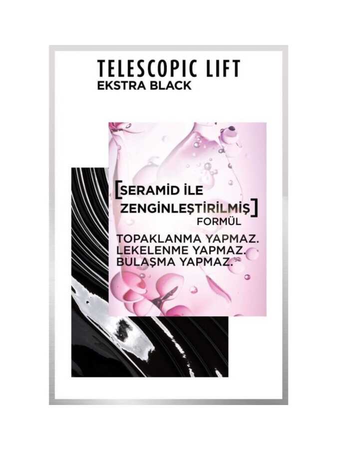 ADD A NEW DIMENSION TO YOUR LOOKS with the new Telescopic Lift Extra Black Mascara from L'Oréal Paris! Lifting, lengthening and volume effects on your lashes all together! With its special double-comb brush, it lifts the lashes, separates them one by one, and gives volume and +5mm length* effect. It cares for the lashes with its ceramide-enriched formula, and does not clump, smudge or smudge. Try the lifting effect of the new Telescopic Lift Mascara that lasts all day! It grasps and lifts the lashes It does not clump Does not smudge Does not smudge Does not weigh down the lashes Suitable for sensitive eyes Provides care *Instrumental test, 25 women